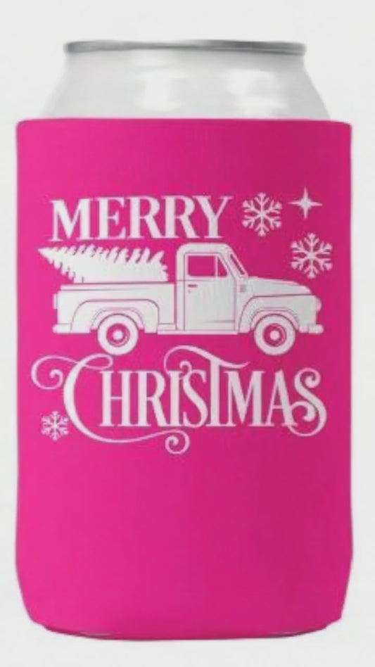 Christmas Can Cooler Collapsible Neoprene 12oz Koozie For Standard Cans With Tree And Truck Merry Christmas Design