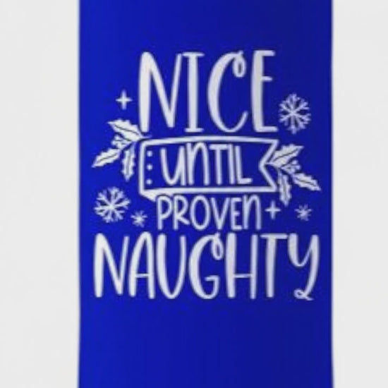 Nice Until Proven Naughty Christmas Can Coozie Cooler 12oz Slim Cans. Screen printed on a thick, quality collapsible neoprene can coozie / can cooler. Fits standard slim cans such as energy drinks, seltzer drinks, and skinny beers. Comes with attached C hook to attach to peg or display. Nice Until Proven Naughty Christmas Slim Koozie.