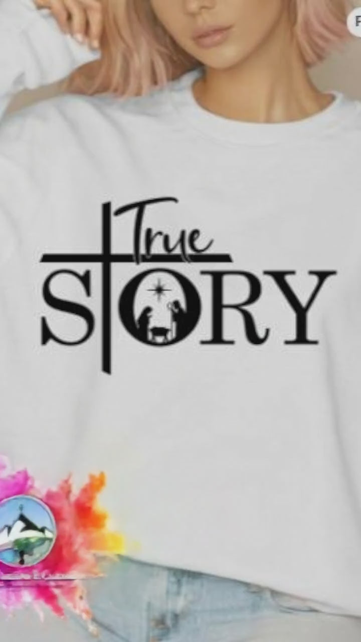 1) Title: Seasonal Christmas True Story Sweatshirt Unisex Faith Based Graphic